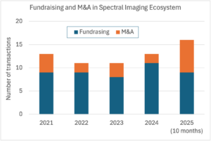 - Fundraising and M&A activity have intensified (see the figure), as industrial players and investors position themselves strategically in spectral imaging.